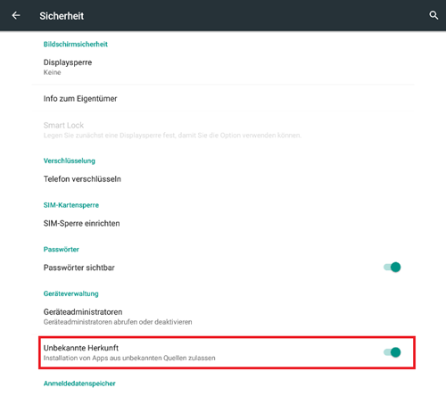 dass das Gerät Zugriff auf unbekannte Quellen hat (Anwendungen, die nicht von Google Play installiert wurden).