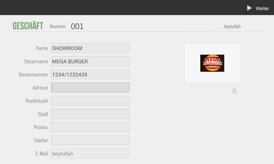 Geben Sie die Informationen Ihrer Einrichtung und des Terminals ein, das Sie konfigurieren. Diese Informationen werden im Verkaufsticket angezeigt und können nach Abschluss der Installation auch über die Konfiguration geändert werden.